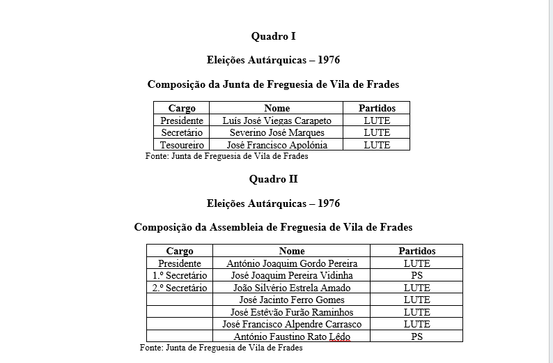 Na ausência de qualquer arranjo político pré-eleitoral, como tudo indica, o prestígio do presidente de Junta de Vila de Frades, eleito pela “Lista Unitária dos Trabalhadores de Esquerda”, impôs-se com naturalidade dado seu prestígio, acontecimento que sublinha o facto da nossa democracia ter no seu “código genético” a revolução popular que a precedeu.