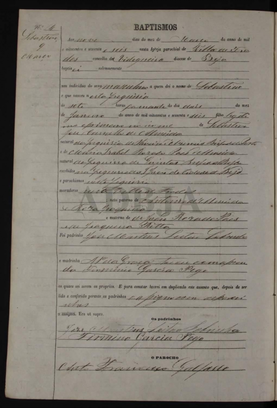 O documento em destaque corresponde ao assento de batismo de Sebastião José Carvalho de Almeida Júnior, nascido a 2 de janeiro de 1866 na freguesia de Vila de Frades, concelho de Vidigueira.