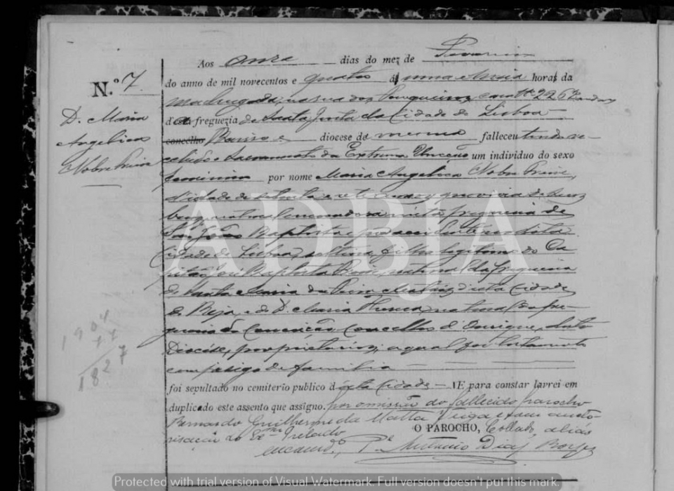 Na madrugada de 11 de fevereiro do ano de 1904 faleceu na freguesia de Santa Justa da cidade de Lisboa, D, Maria Angélica Nobre Freire. Este acontecimento foi registado no livro de assentos de óbitos do ano de 1904 da Paróquia de São João Batista, concelho de Beja.