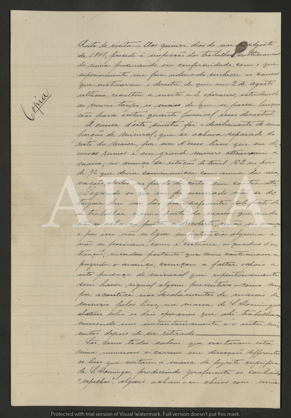 Os documentos apresentados correspondem a uma cópia de um Auto de visita à Mina de São Domingos e do respetivo Mandado de Intimação enviados ao Governador Civil de Beja pelo Administrador do Concelho de Mértola na sequência de um acidente ocorrido na Mina de São Domingos no dia 15 de agosto de 1888 e que vitimou dois mineiros.