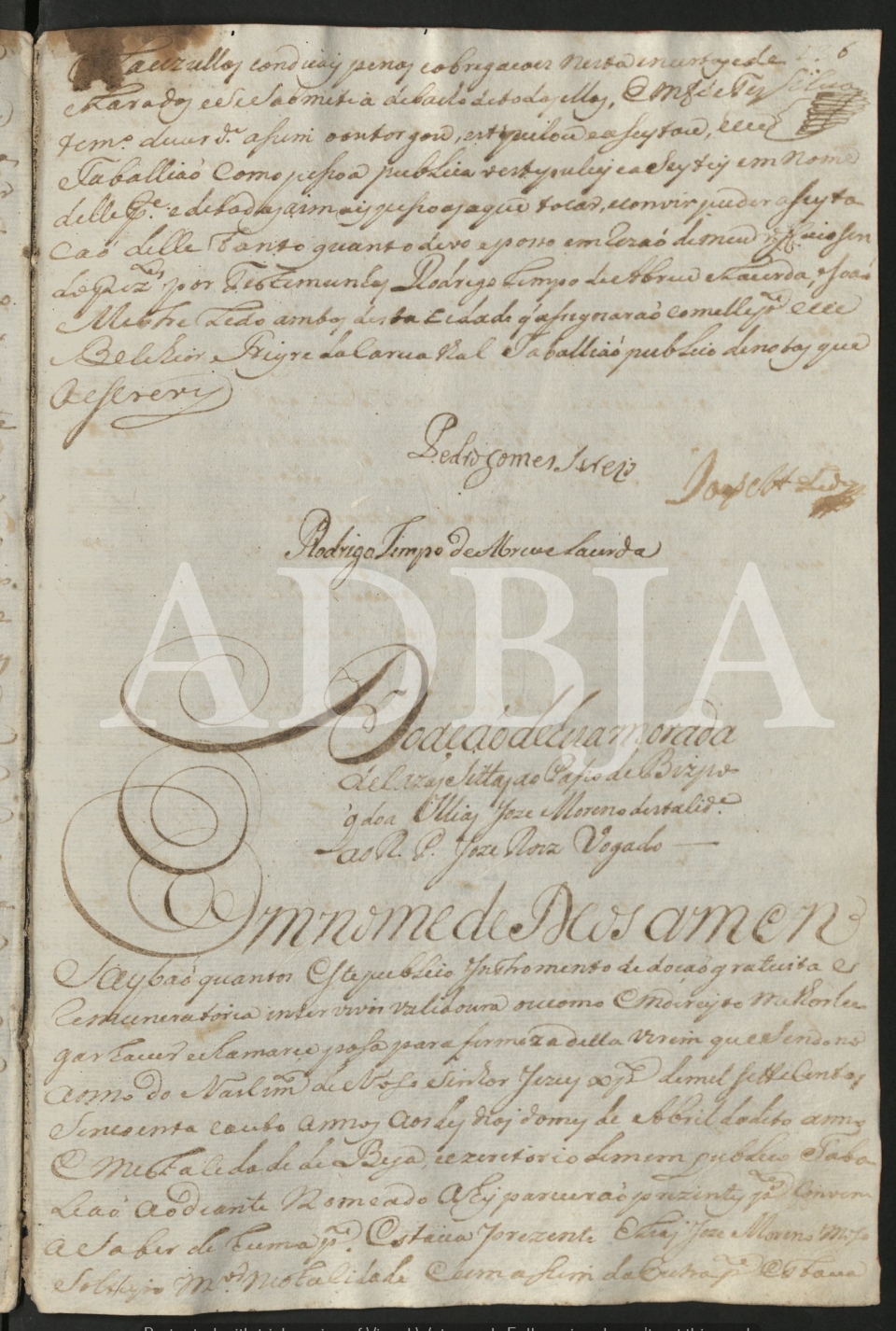 A escritura de dote foi lavrada no escritório do Real Tabelião Público de Notas Belchior Freire do Carvalhal, no dia 10 de Abril de 1798, na presença de duas testemunhas idóneas e reconhecidas do tabelião: Rodrigo Limpo de Abreu Lacerda e José Mestre Ledo, ambos da cidade de Beja.