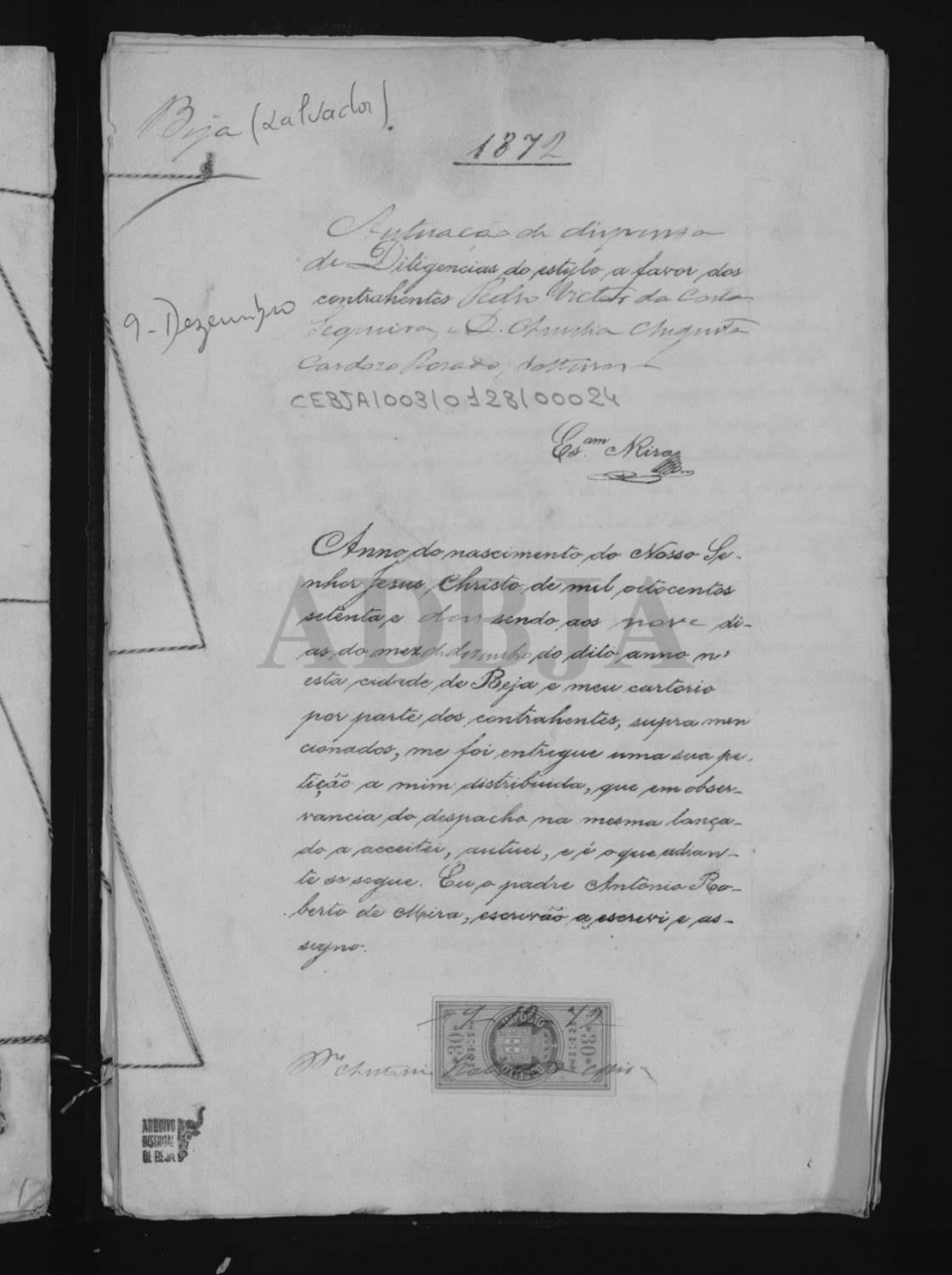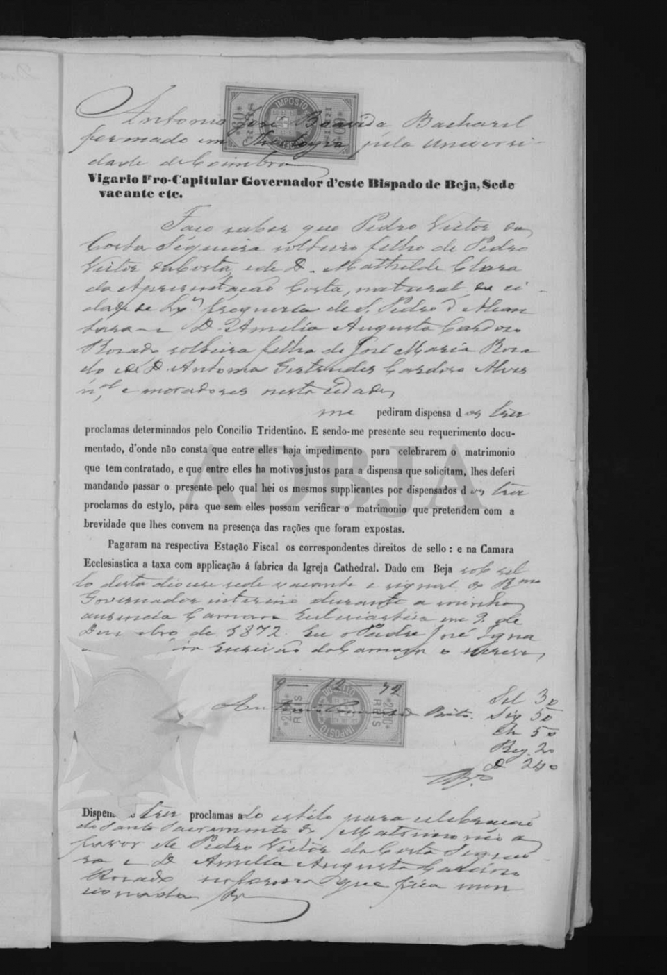 O documento apresentado diz respeito ao processo de casamento de Pedro Victor da Costa Sequeira com D. Amélia Augusta Cardoso Rosado. Datado de 9 de dezembro de 1872 este processo tem em vista a verificação pela Câmara Eclesiástica de Beja das condições apresentadas pelos futuros nubentes para a celebração de matrimónio.