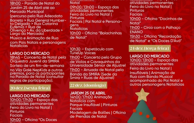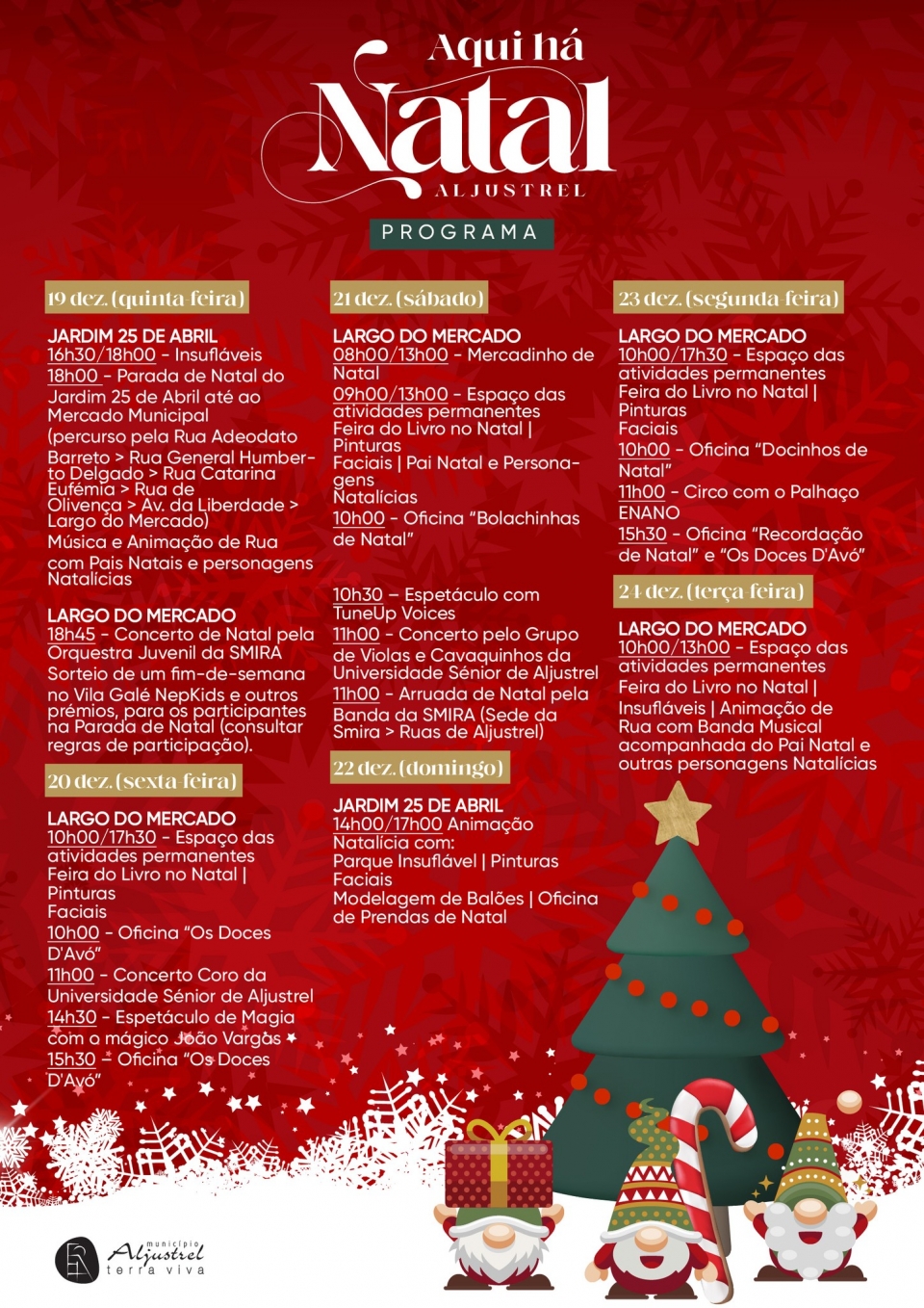 No dia 20, a partir das 10:30 horas, no Largo do Mercado Municipal, haverá atividades permanentes na Feira do Livro do Natal, pinturas faciais, como também oficinas de “Os Doces da Avó”, um concerto do Coro da Universidade Sénior de Aljustrel e um espetáculo de Magia com João Vargas.