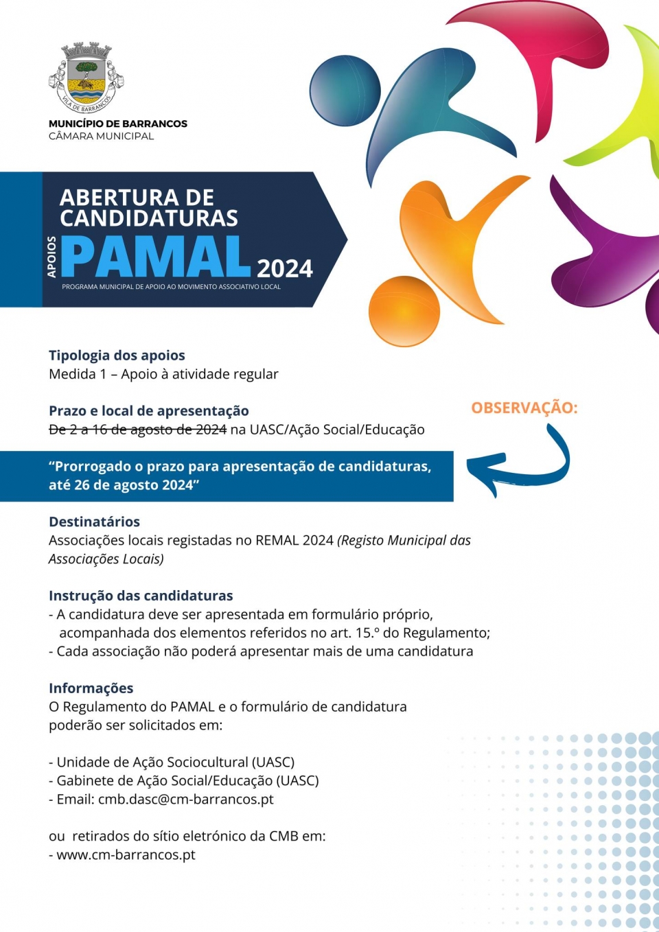 A Câmara Municipal de Barrancos promove, desde 2008, o Programa Municipal de Apoio ao Movimento Associativo Local (PAMAL), que objetiva o apoio financeiro às entidades associativas locais. O prazo de apresentação de candidaturas foi prorrogado até ao dia 26 de agosto.