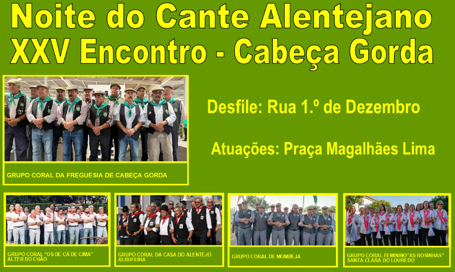 Trata-se do XXV Encontro de Cante promovido pelo Grupo Coral de Freguesia de Cabeça Gorda, para promover e preservar o património do cante alentejano. Os grupos participantes atuam em desfile na ria 1º de Dezembro depois no palco que está instalado na Praça Magalhães de Lima.