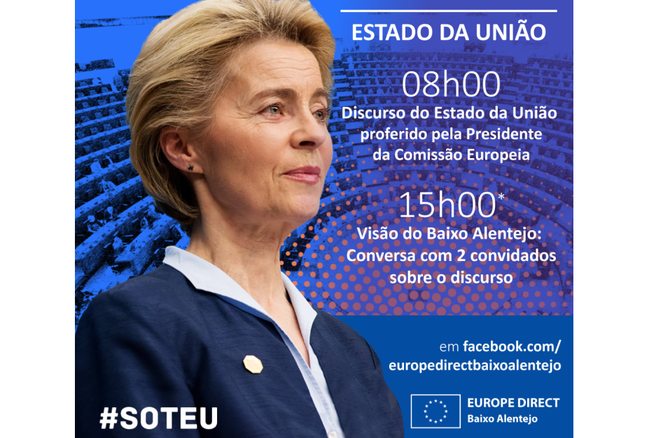 A Presidente da Comissão Europeia, Ursula von der Leyen, profere, hoje, o seu segundo discurso sobre o estado da União. O Europe Direct Baixo Alentejo dedica o dia a este evento,