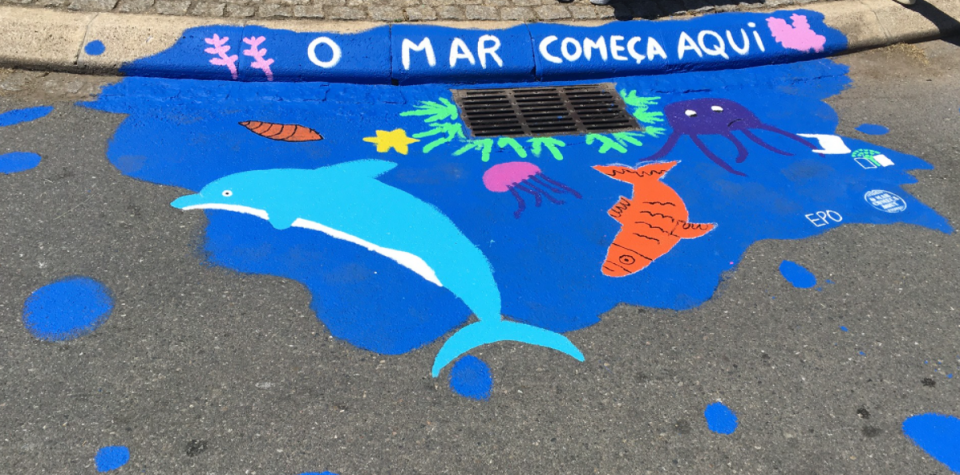 pintura em torno de sarjetas nas ruas com o objetivo de sensibilizar para o