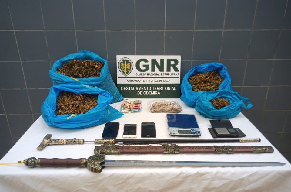 Da apreensão constam ainda duas armas brancas, três telemóveis, duas balanças digitais de precisão, material de recorte e embalamento de produto estupefaciente e 125 euros em numerário.