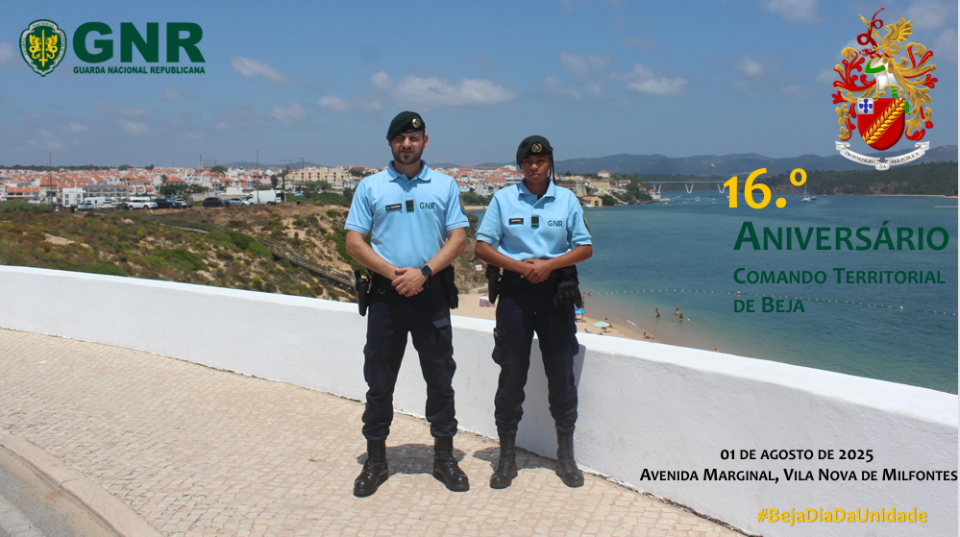 O Comando Territorial de Beja da Guarda Nacional Republicana (GNR) assinala, hoje, pelas 11.00, o Dia da Unidade. A comemoração vai acontecer com a realização de uma cerimónia militar na Avenida Marginal, em Vila Nova de Milfontes, no concelho de Odemira.