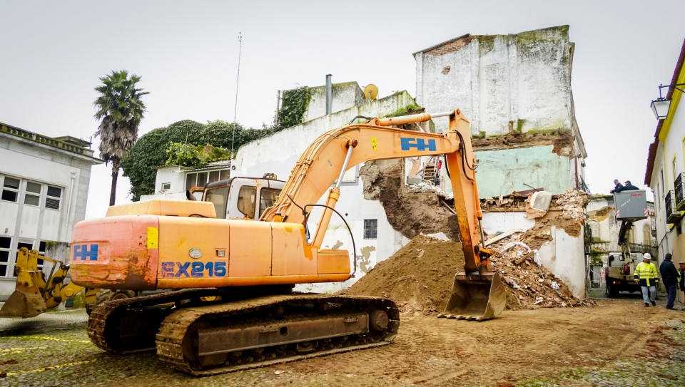 Neste prédio da Rua Alexandre Herculano, técnicos do município, com o apoio de uma retroescavadora e uma máquina giratória, procedem a trabalhos de demolição da casa, que já estava em mau estado, mas a situação agravou-se com as intempéries e algumas partes caíram nos últimos dias.