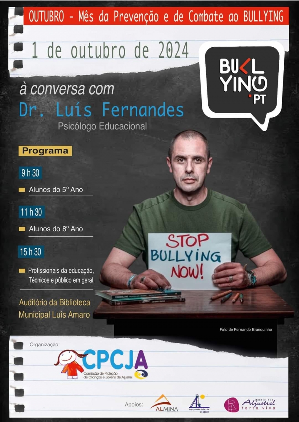 A Comissão de Proteção de Crianças e Jovens (CPCJ) de Aljustrel assinala, hoje, no auditório da Biblioteca Municipal Luís Amaro, o Mês da Prevenção e de Combate ao Bullying.
