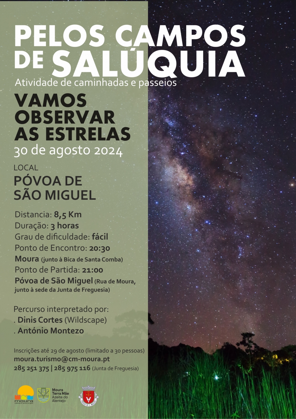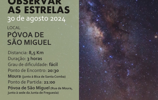 “Vamos observar as estrelas” é o nome da próxima atividade integrada no conjunto de caminhadas e passeios intitulado “Pelos Campos de Salúquia”. A iniciativa ocorre dia 30 de agosto em Póvoa de São Miguel, com um percurso de 8,5 Km. As inscrições encontram-se abertas até 29 de agosto.