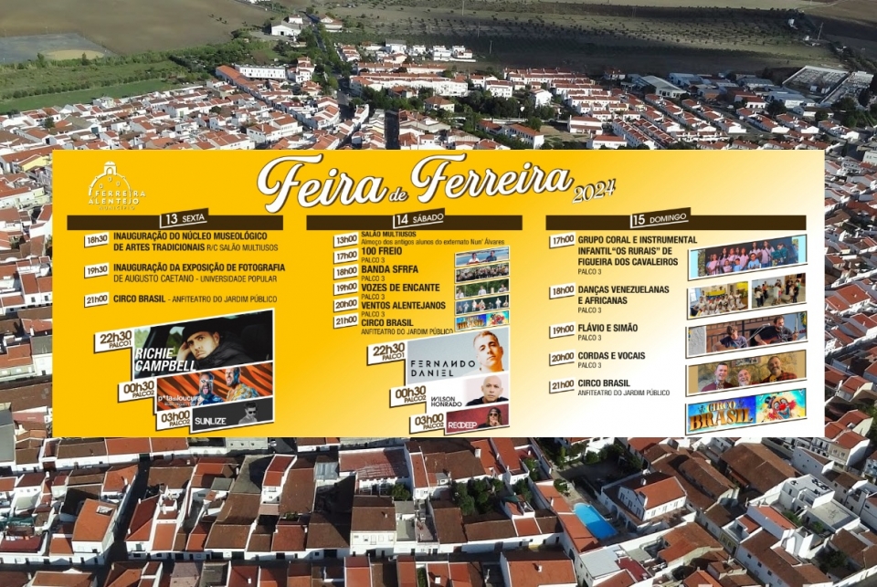Ferreira do Alentejo prepara-se para viver mais uma edição da tradicional feira do concelho, de 13 a 15 de setembro. Richie Campbell, Fernando Daniel, P*uta da Loucura, Wilson Honrado, Sunlize e Reddeep são os cabeças de cartaz desde ano.