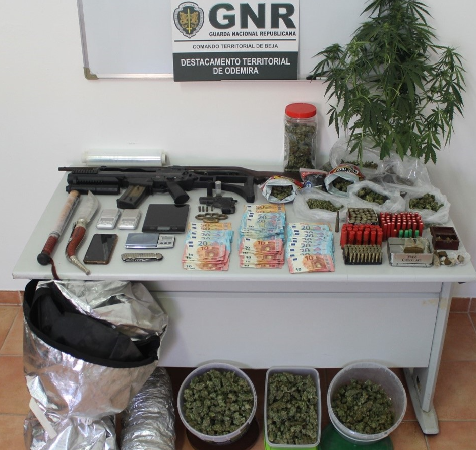 A GNR apreendeu ainda no decorrer da operação uma pistola de alarme, uma carabina de ar comprimido, uma réplica de arma de ‘airsoft’, um taco de madeira, uma soqueira, duas armas brancas, um telemóvel e diverso material relacionado com acondicionamento de produto estupefaciente.