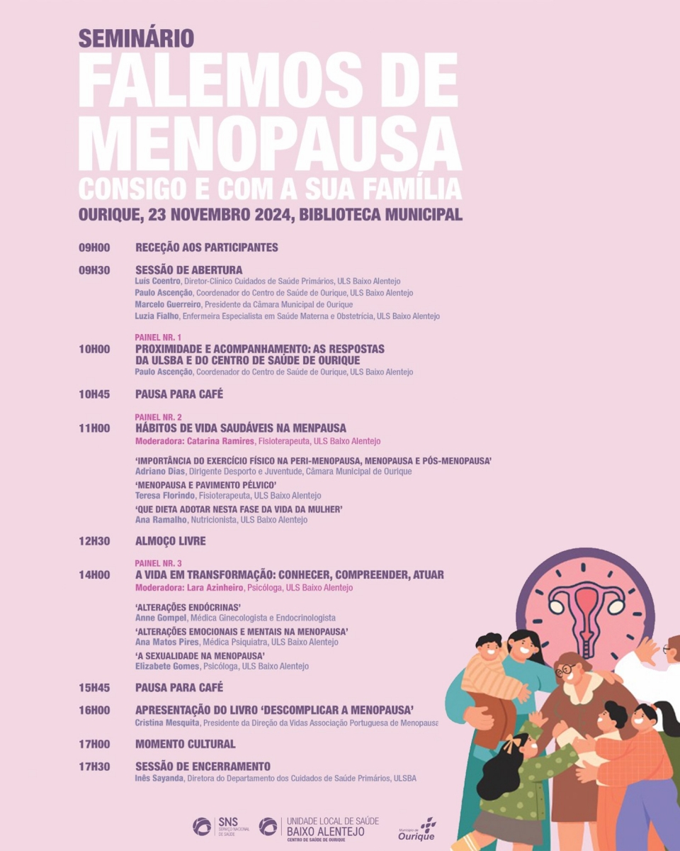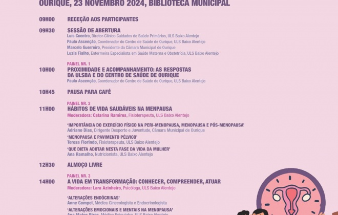 “Este seminário é uma oportunidade para se informar e refletir sobre um tema tão importante. Informação especializada será disponibilizada, abordando temas como hábitos de vida saudáveis, transformações físicas e emocionais, nutrição e exercício físico na menopausa e pós-menopausa, sempre com a orientação de especialistas qualificados, prontos para esclarecer todas as suas dúvidas”, explica a Câmara Municipal de Ourique.