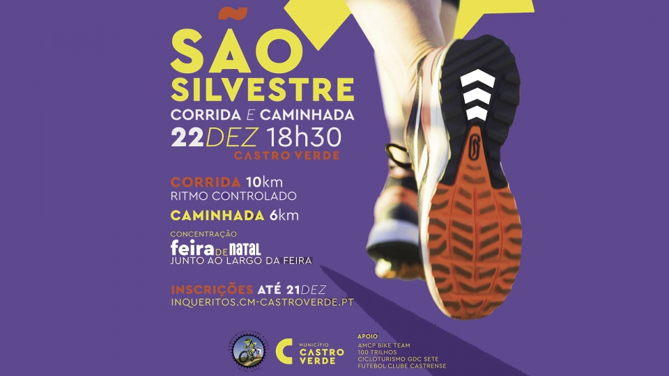 A São Silvestre de Castro Verde realiza-se esta segunda-feira, com partida marcada para as 18h30, integrando duas vertentes: uma corrida de 10 quilómetros, disputada em regime de ritmo controlado, e uma caminhada de 6 quilómetros, aberta à participação de toda a comunidade.