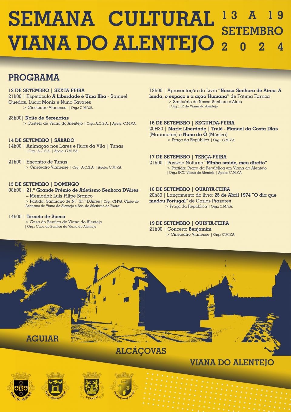 A Semana Cultural é promovida pelo Município de Viana, com o apoio das Juntas de Freguesia de Aguiar, de Alcáçovas, de Viana do Alentejo, e de associações locais.
