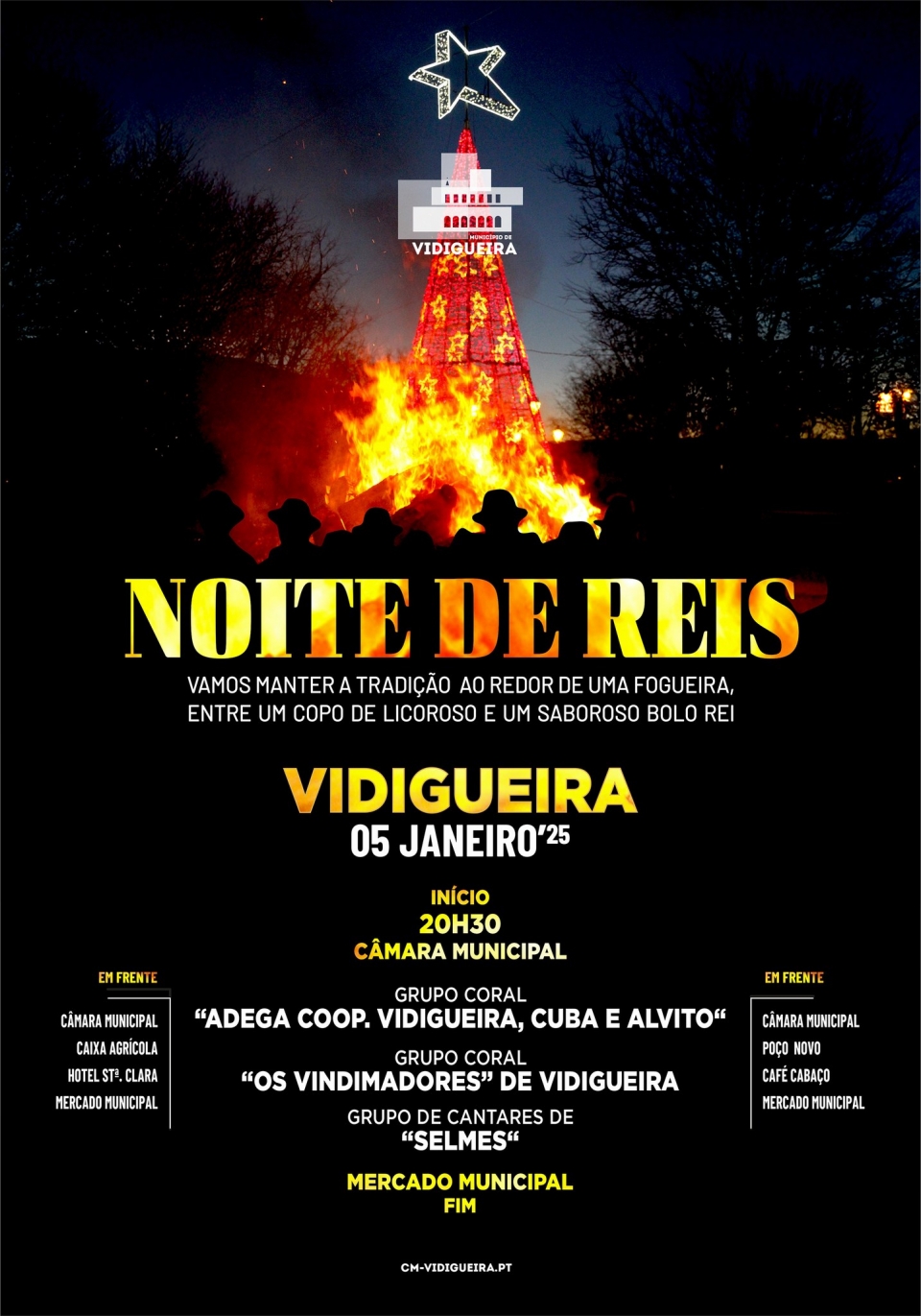 “Ao redor de uma fogueira, entre o copo de licoroso e um saboroso bolo rei”, o Município de Vidigueira organiza, hoje, uma "Noite de Reis", com a participação de grupos corais e musicais do concelho. A iniciativa tem início às 20h30, no Mercado Municipal.