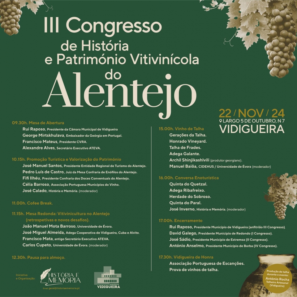 Numa parceria entre o Município de Vidigueira e a História e Memória, a Adega do Canena, em Vidigueira, recebe, no próximo dia 22 de novembro, o III Congresso de História e Património Vitivinícola do Alentejo.